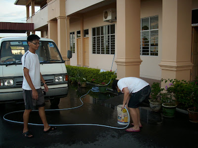 We clean the whole church bit by bit. Back, main hall, toilet, baby's room and corridor. The last thing that we all washed together is the van.